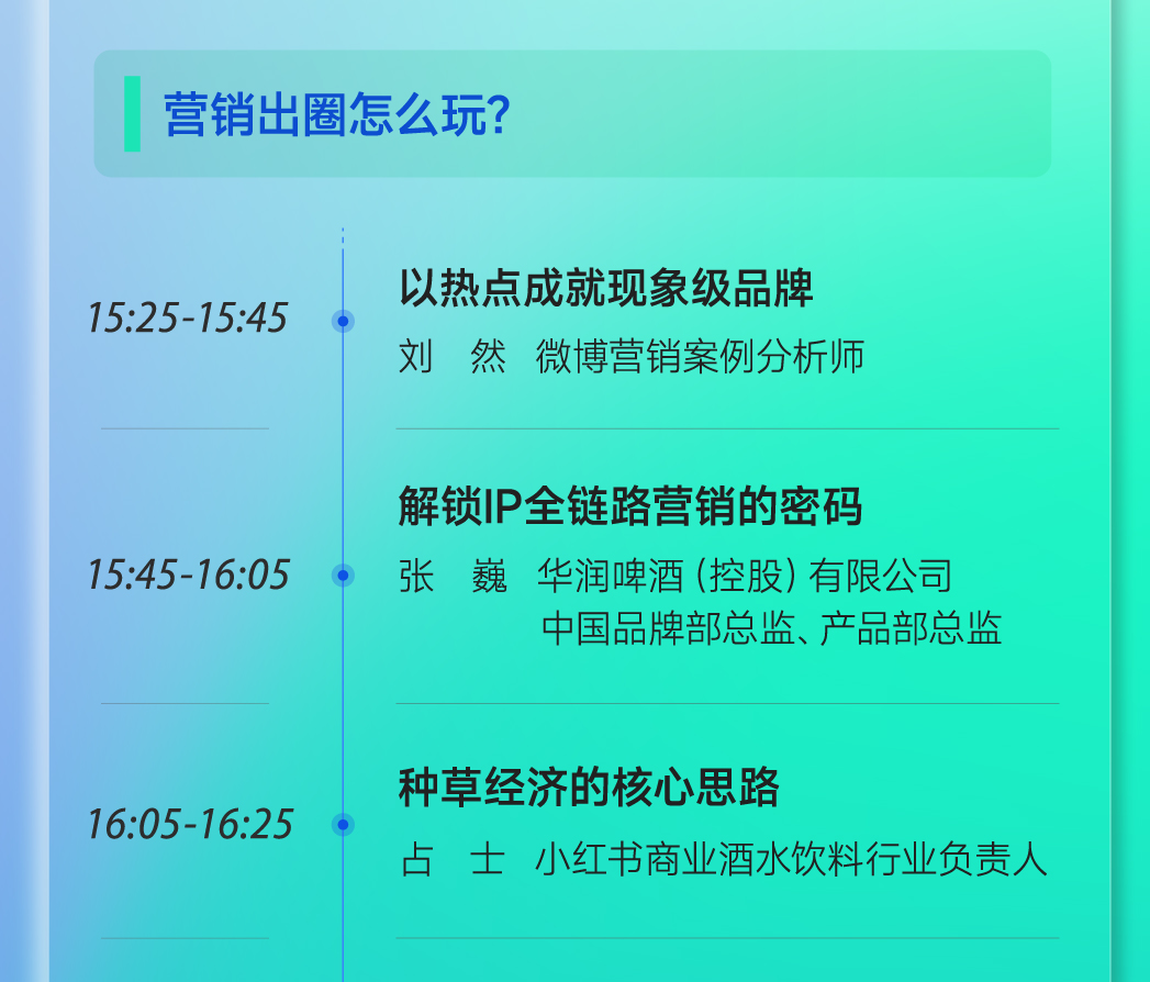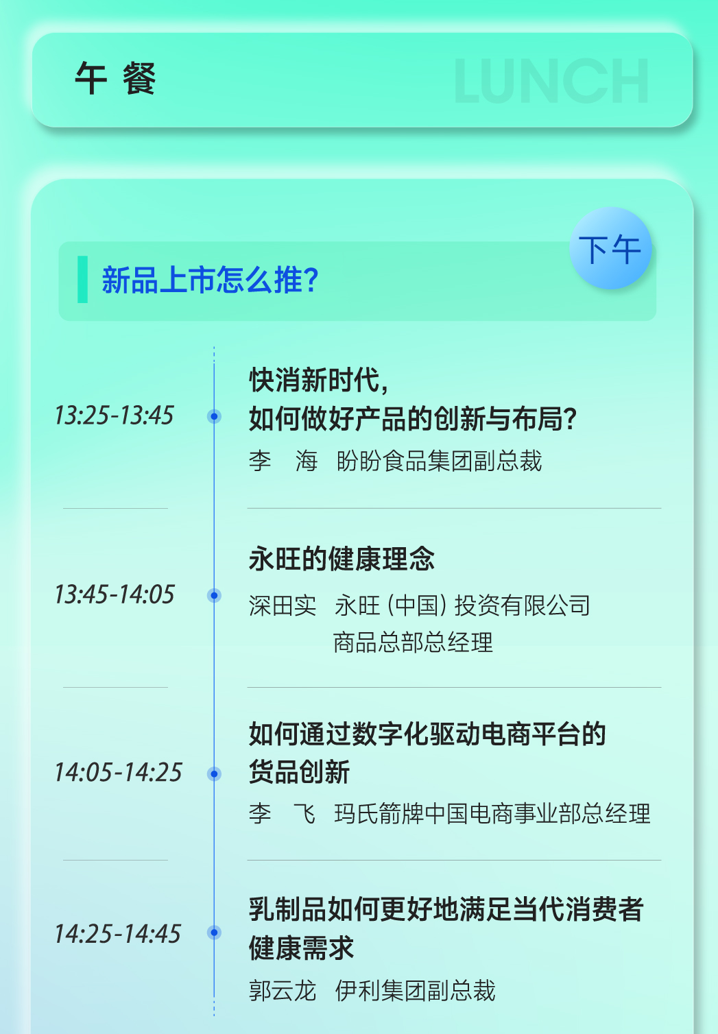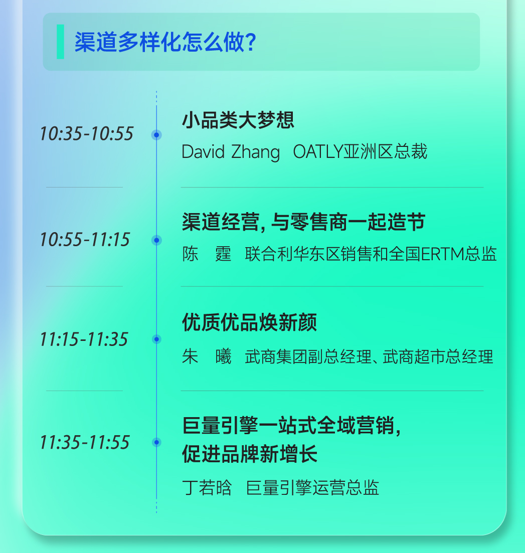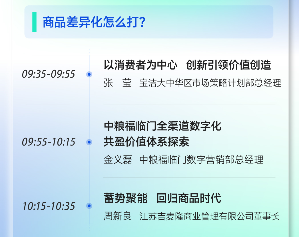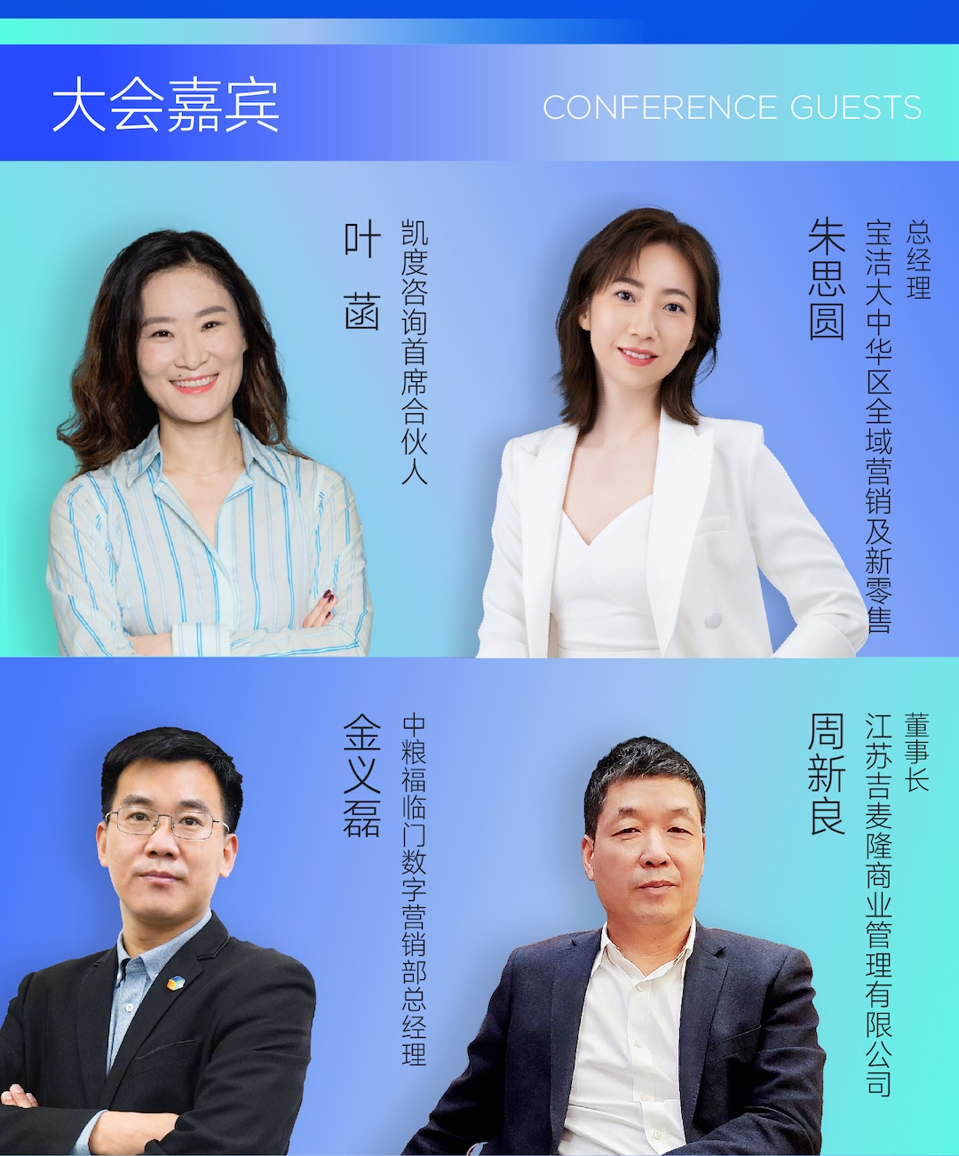宝洁、联合利华、中粮福临门、永旺、京东、华润啤酒、伊利、玛氏箭牌、盼盼、OATLY、吉麦隆等快消巨头、领军零售企业,抖音、小红书、微博、凯度咨询、契胜科技、京东科技等当红流量平台、专业咨询机构、数字化服务商现身分享。全新日程已定,期待您的参与!
