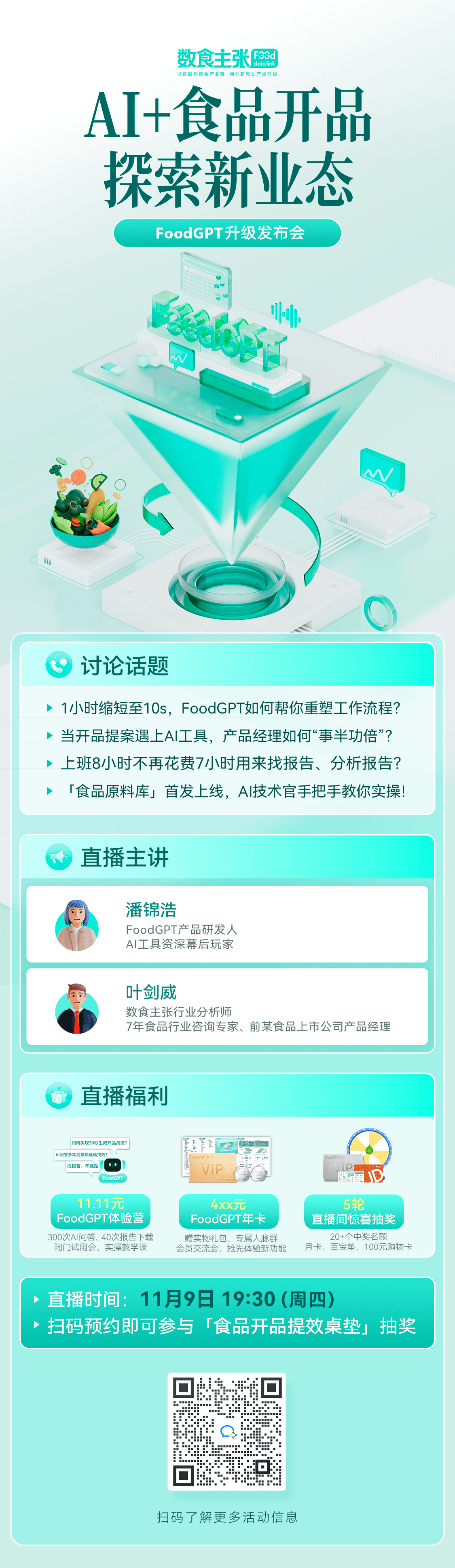 11月9日周四晚上19:30,FDL数食主张邀您参与FoodGPT升级发布会,共同领略科技魅力,欢迎识别文末海报二维码预约直播并参与抽奖哦~
