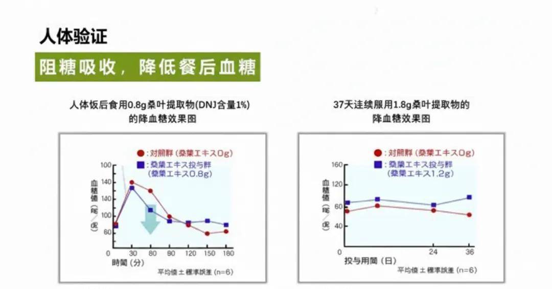 - 前端拦截(桑叶):桑叶中的核心活性成分DNJ(1-脱氧野尻霉素),是一种强效的α-葡萄糖苷酶抑制剂,Kimura等证实了DNJ分子的降血糖作用最为显著。研究显示,其可在小肠中“设卡”,延缓碳水化合物分解为葡萄糖的速度,从源头减少糖分吸收,是名副其实的“第一道防线”。