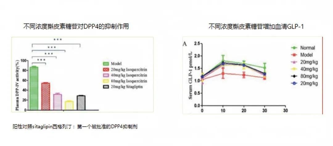 - 节流——保护GLP-1活性:GLP-1虽好,但在体内却极易被DPP-4酶降解而失效,经过酶解处理的槐米粉则扮演了GLP-1“守护者”的角色。实验数据显示,槐米的核心成分槲皮素糖苷能显著抑制DPP-4的活性,从而保护并提升内源性GLP-1的水平。更值得关注的是,当浓度提升至80 mg/kg时,其抑制效果甚至超越了经典的DPP-4抑制剂药物西格列汀。这充分展示了其卓越的生物活性与巨大的应用潜力。