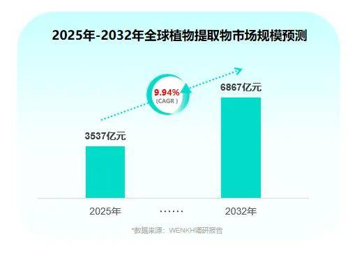 这股高涨的需求,正强力推动着食品饮料、医药及化妆品等行业对天然植物提取物的广泛应用,进一步推动全球天然植物提取物市场的快速增长。据WENKH研究报告预测,全球植物提取物市场规模将从2025年的3537亿元增长至2032年的6867亿元,年复合增长率预计高达9.94%。