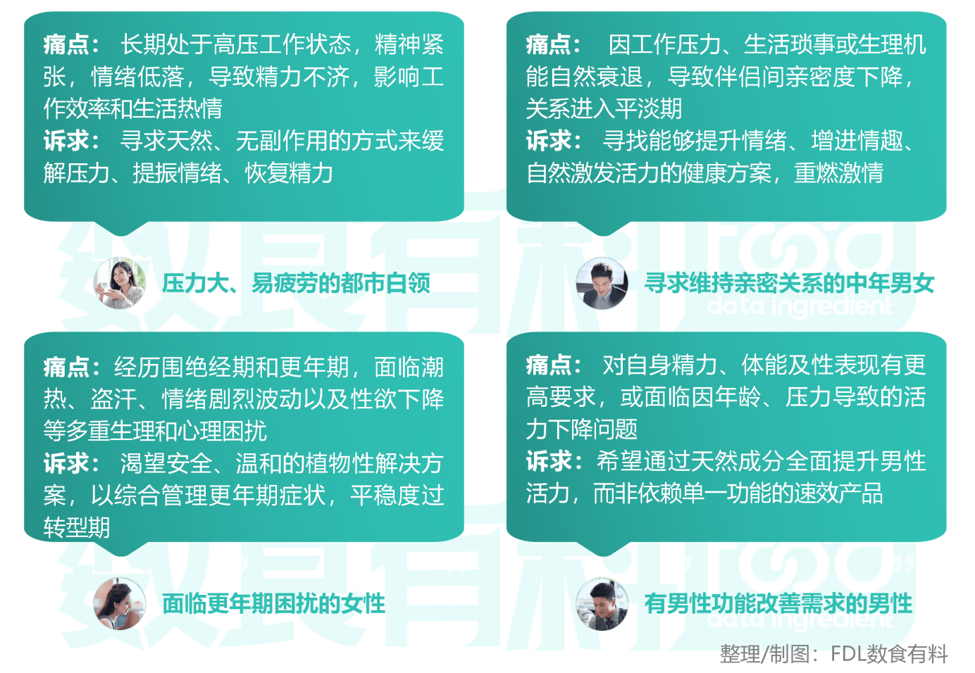 女性更年期市场需求复杂,涉及潮热、情绪波动、睡眠质量下降和性欲减退等多种困扰。达迷草因其在调节荷尔蒙、改善情绪和提升性欲方面的潜力,成为该领域极具价值的成分。创新方向可打造专为更年期女性设计的综合支持方案,精准应对复合型困扰。