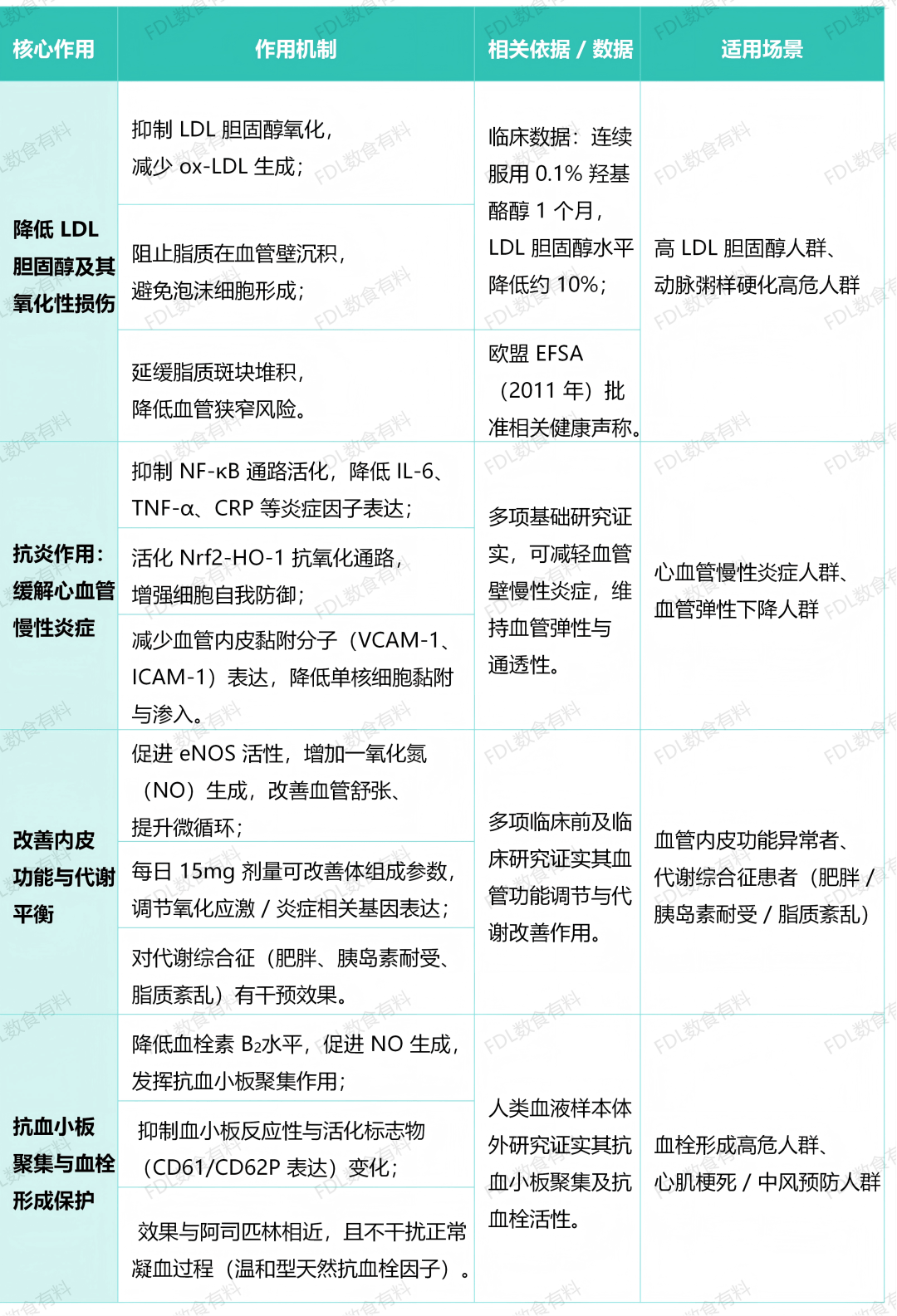 综上所述,羟基酪醇凭借其抗氧化、抗炎、改善内皮功能、调节代谢以及温和抗血栓的多重药理活性,构建了一个全面的心血管保护体系。它不仅能够有效干预动脉粥样硬化早期的形成与发展,对代谢异常和血栓终末事件同样具备预防作用,为心血管疾病的预防和辅助治疗提供了天然的潜在策略。