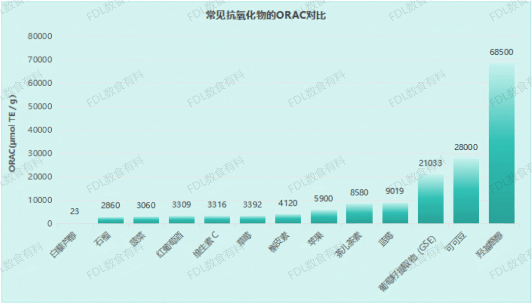 在自由基学说的科学解析下,抗氧化剂的重要性不言而喻。如下图所示,数食有料对比常见的抗氧化剂,如白藜芦醇、石榴、红酒多酚、维生素 C 等,其 ORAC 值大多处于几千到一万的区间。然而,羟基酪醇 (Hydroxytyrosol) 的 ORAC 值格外突出,高达 68500 µmol TE/g,远远领先于其他熟知的抗氧化剂,甚至数倍于高效抗氧化剂葡萄籽提取物 (GSE)。证明了羟基酪醇在清除自由基、抵御氧化损伤方面具备无与伦比的卓越能力。
