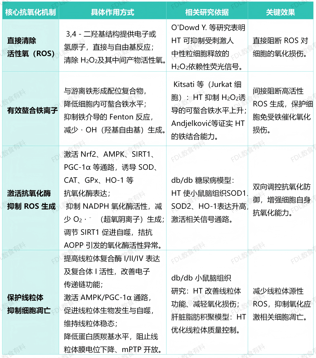 综上所述,羟基酪醇通过直接清除活性氧、螯合铁离子、激活细胞内抗氧化酶系统、抑制ROS生成及改善线粒体功能等多重机制,展现出卓越的抗氧化效果。