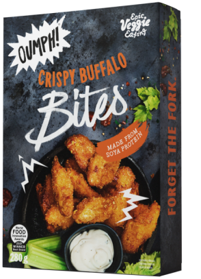 Oumph!推出的一款冷冻素食炸牛肉块,原料含水牛酱、香料、大豆蛋白浓缩物、面包屑、菜籽油等。