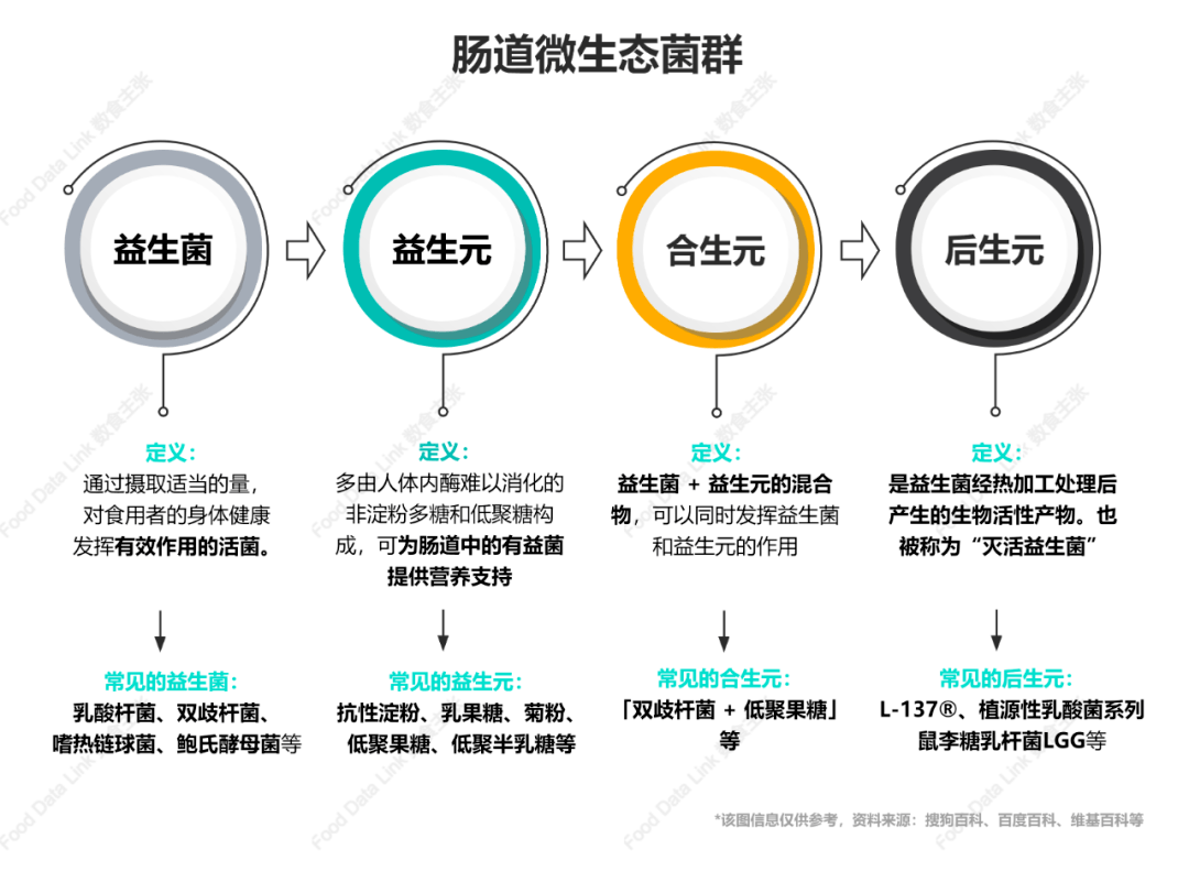 在肠道健康领域,益生菌产业经历了从“益生菌能活着到肠道”,到以益生菌名称、益生菌数作为调理肠道功能依据,再到特定细分功能益生菌应用的转变。从肠道健康的角度看,益生菌、益生元、合生元、后生元在人体内都发挥着重要作用: