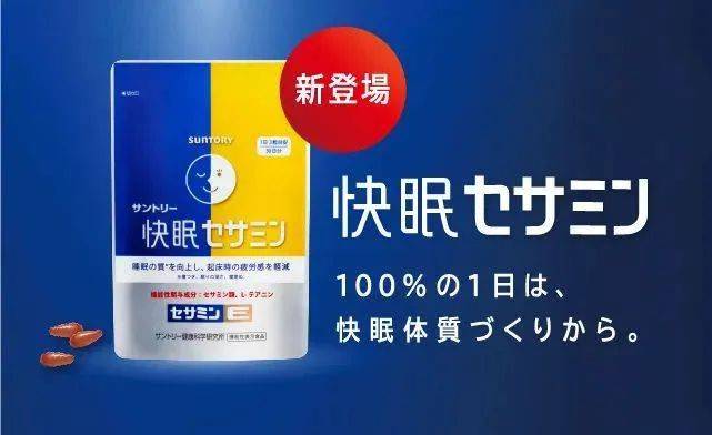 日本Suntory(三得利)于2022年1月19日推出助眠产品“快眠セサミン(快眠芝麻素)”。该产品含有抑制褪黑激素减少的芝麻素和支持调节身心健康相关神经的茶氨酸。据悉,该产品通过两款天然健康的“植物力量”来提高消费者的睡眠质量,能够有效减少人们醒来时的疲劳感。此外,包装以深蓝色和黄色为基调,搭配以昼夜为主题的插图,其设计理念是为了突显其提高睡眠质量、改善醒来后状况两个维度上具有强大效果的形象。