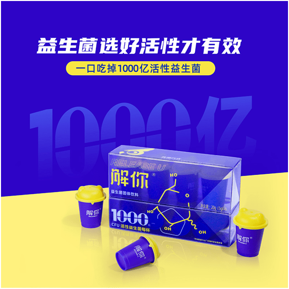 雀巢孵化的益生菌新锐品牌——曼士元,上市首款“解你益生菌固体饮料”。据介绍,产品由6种“实力派”明星益生菌组成,包括乳双歧杆菌、植物乳杆菌、鼠李糖乳杆菌等,每种菌株的胃酸存活率高达90%,每一口可吃进约1000亿活性益生菌。除外,产品特别加入了专利D-核糖、天然雪莲果精华与藻蓝蛋白等有机成分,可有效提高益生菌活性,刺激肠道有益菌群生长并抑制有害菌,有助于肠道免疫健康。