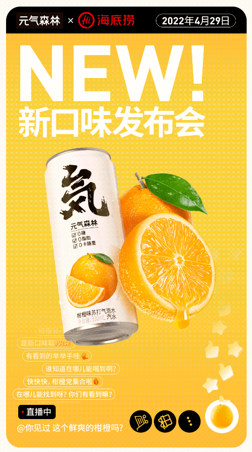2、近日,元气森林官方披露,将正式对外推出柑橙口味330毫升罐装气泡水。据了解,元气森林此次推出的柑橙苏打气泡水针对佐餐场景打造,秉承“0糖0脂0卡”和“0化学防腐剂”的产品理念,该新品将指定海底捞全国门店为独家首发渠道,该款气泡水将在海底捞全国超过1000家门店作为火锅佐餐饮料亮相。(资讯来源:电商报)