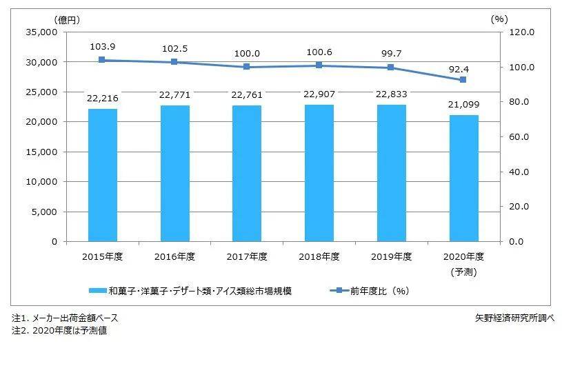 日本人嗜甜,品尝甜食已经成为一种国民习惯。根据日本著名数据分析机构矢野经济研究所的调研数据显示,2019年日本和/洋甜食市场规模达到22833亿日元。2020年,受新冠病疫情影响,市场规模虽整体缩水,但仍高达21099亿日元。