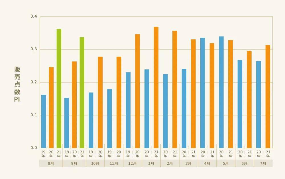 根据日本ShopperInsight的数据分析结果显示,从2019年以后开心果整体PI值(PI值:商品PI值,也叫千人购买率,衡量商品被消费者关注程度的数值)呈现上涨趋势,到2021年更是出现高速上升势态。仅2021年8月就较2020年同比增长147.1%,较2019年同比增长高达223.7%。