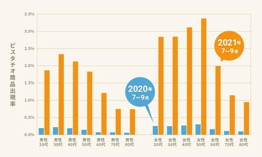 同时,日本manamina数据公司基于网络搜索“开心果”关键词的用户的性别属性进行分析后发现,在开心果甜食的忠实拥趸中,女性消费者占据大壁江山,占比达到七成。