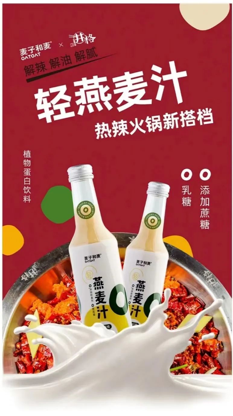 4、聚焦火锅饮食场景,麦子和麦携手人气重庆火锅品牌“井格”联名推出一款全新植物蛋白饮料:轻燕麦汁。据介绍,该产品特别为“吃火锅”这一特定餐饮场景而研发,每瓶都有满满的燕麦膳食纤维,麦香醇厚,解辣解油又解腻。此外,新品不含蔗糖和乳糖,放肆嗨吃无负担。新品目前已上市。(资讯来源:foodaily)