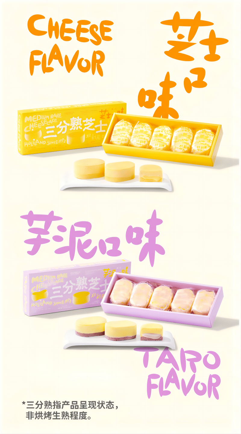 5、10月23日,好利来推出三分熟芝士新品。共有芝士味和芋泥味两种口味。据品牌方介绍,新品选用法国进口芝士,特调配比,芝香软嫩。三分熟指产品呈现状态,非烘烤生熟程度。官方售价180g*5枚/盒/40元。(资讯来源:Holiland好利来)