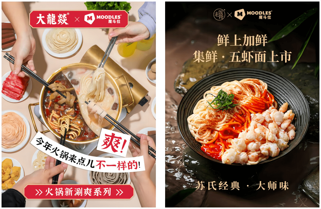 1、MOODLES魔斗仕推出两款联名产品:大龙燚联名新火锅涮品及老饭骨联名「老饭骨 · 五虾面」。其中,新涮品“涮爽系列”联合了10年成都老火锅品牌大龙燚共创推出,包括黑虎虾滑爽、深海鳕鱼爽和劲道牛肉爽三款产品,实现了新兴食品科技与经典川渝风味的碰撞。